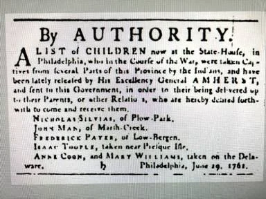 Nicholas Silvius was born to German immigrant parents on January 15, 1743, in Lehigh Township, Bucks Co. PA. He had 5 siblings. In 1755, he and his younger sister, Anna, were hiding in hay in their barn while their parents went to a mill. Even so, the two children were captured by Indians and taken to Montreal, Canada, where they spent five years in captivity. In 1761, they were returned to Philadelphia. On June 16, 1761, an ad appeared in Ben Franklin’s Pennsylvania Gazette listing 5 children that were returned to the State House. Nicholas Silvius’s name was on the list.