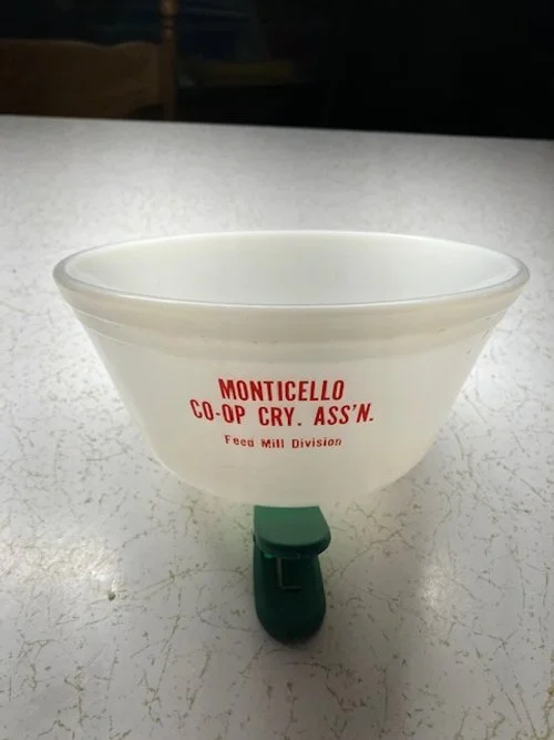 Over the years, customers would look forward each holiday season to what their favorite business might soon be offering. Items might include dishes, screw drivers, ash trays, knives, scissors, or yard sticks. What was the source of these items? In this area, Charles Christianson from Monticello, was a local vendor who would visit each small business early in the year with a catalogue of possible offerings. Items would be shipped in time for the holiday season.